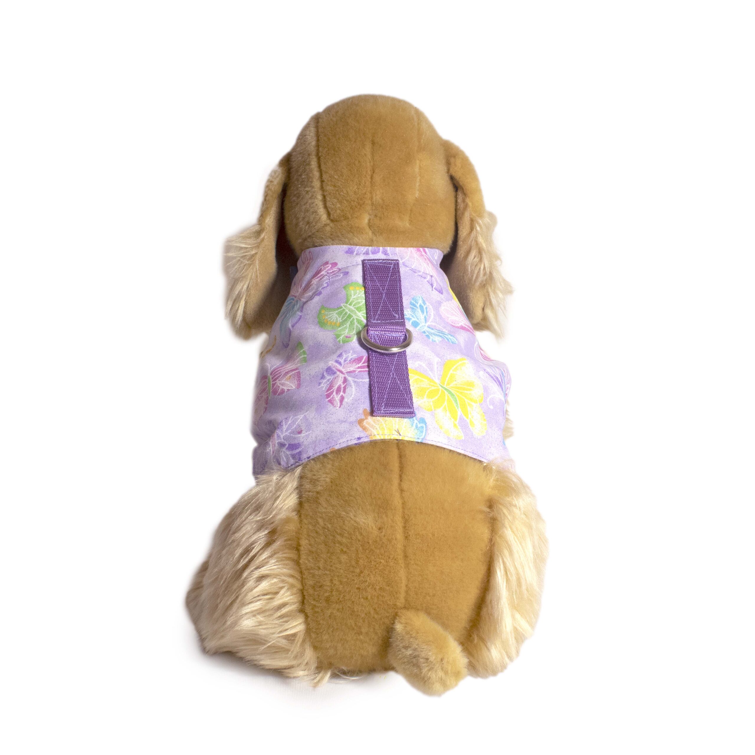 Donna Devlin Designs walking vests are designed to alleviate the pulling and strain on the delicate neck area associated with traditional collars and harnesses by distributing the pull to the strongest part of the dog’s body.  Each walking vest closes with adjustable tabs while reinforced stitching ensures safely and security.  The sturdy nickel plated D-ring on the back of the walking vest makes it easy to attach your leash and is placed correctly at the mid rear of the harness. This is exactly where the pressure should be.